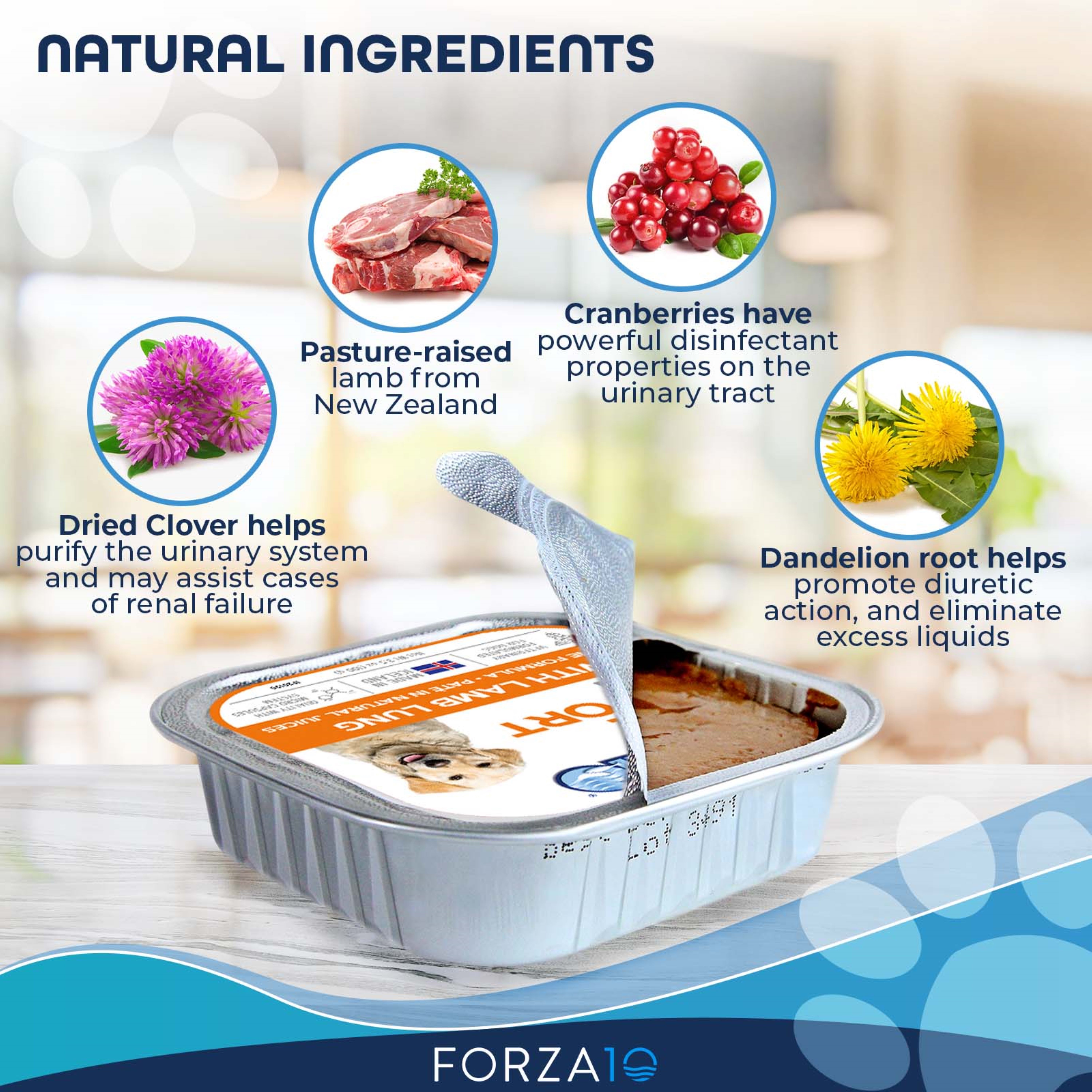 Water sufficient for processing, salmon, chicken liver, lamb, rice, minerals (dicalcium phosphate, calcium carbonate, salt, zinc sulfate, manganese sulfate, potassium iodine), starch, cassia gum, guar gum, locust bean gum, xanthan gum, vitamins (vitamin D3 supplement, vitamin E supplement, thiamine mononitrate, pyridoxine hydrochloride, biotin, folic acid), taurine, vegetable oil, dried dandelion root extract, dried clover extract, cranberries.
