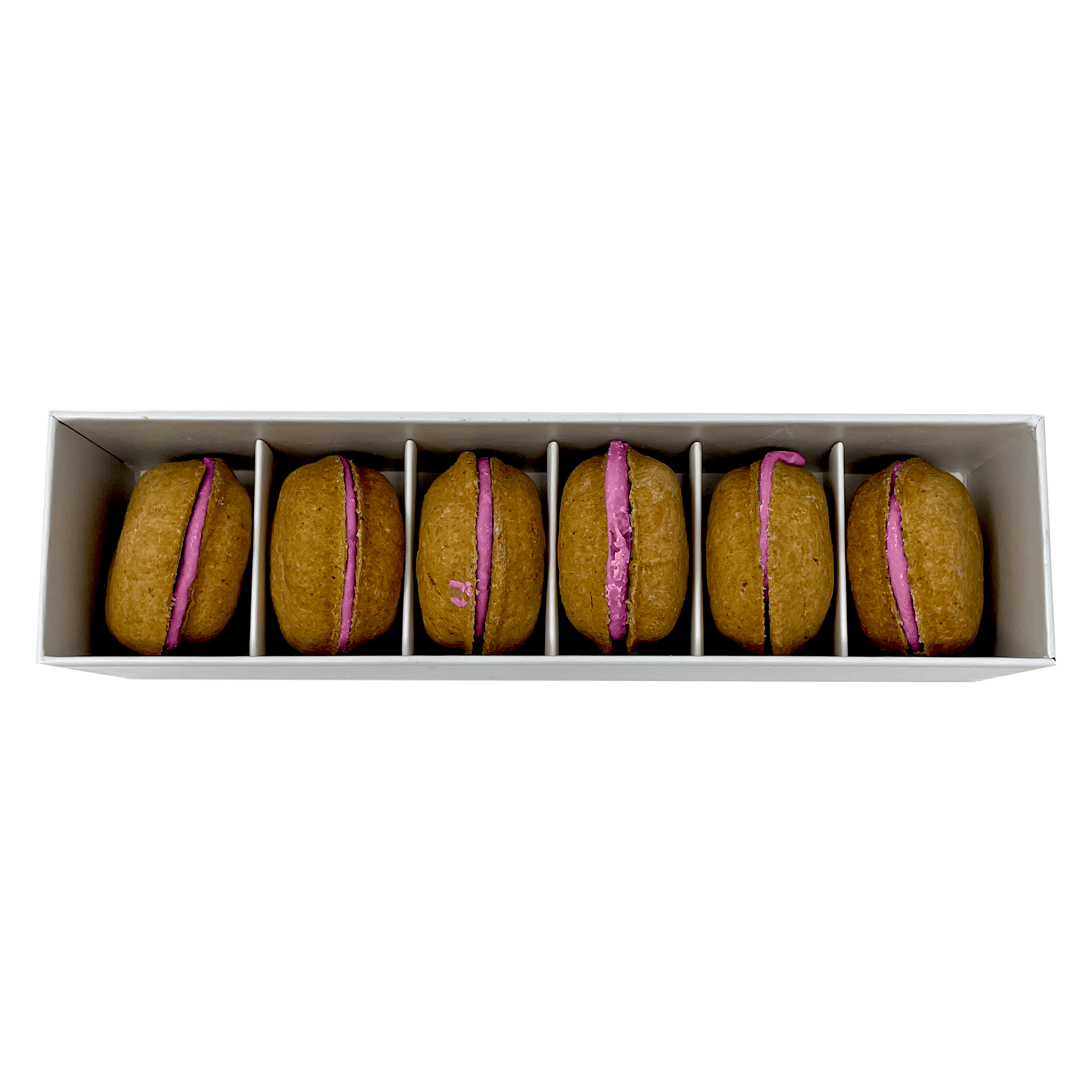 Dog Macarons - Count of 6 (Dog Treats | Dog Gifts)This box of our premium macaron treats features: - Box of 6 dog macarons- Handmade with premium human-grade ingredients in the USA- 100% natural; corn-free; wheat-free ingredients- No artificial coloring or preservatives- Hard treat designed for a long-lasting chew- Shelf life of 12+ months | No need for refrigerationBase Recipe Ingredients: Oat Flour; Honey; Coconut Oil; All-Natural Flavored Yogurt FillingFeeding Instructions:Our treats are hard; designed for a long-lasting chew. For elderly or small dogs; we recommend breaking the treat in smaller pieces (by twisting both sides).
